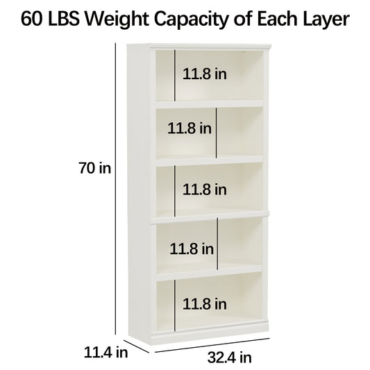 5 Tiers 70" Tall Bookcase, White Bookshelf Open Storage 5 Tier Shelves , Floor Standing Bookshelves and Bookcases, Library Bookcase for Farmhouse Library Office Bedroom Kids